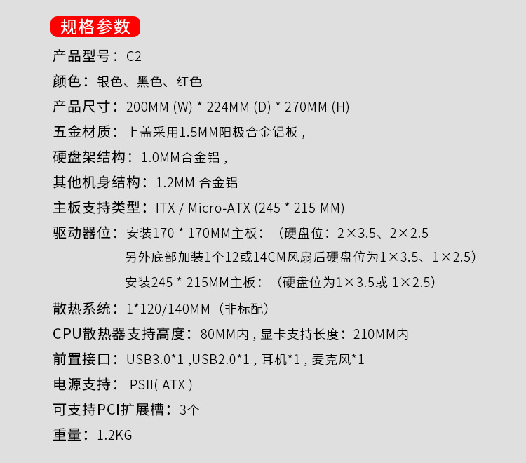 商品名称:乔思伯(JONSBO)C2 银色 MINI机箱(支持24.5*21.5CM尺寸内主板/全铝机箱/ATX电源/80MM高内散热器)