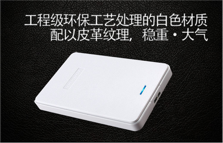 • 独特设计: 经典皮革纹路设计,高强度ABS塑胶材质,液压平衡滚轴系统,超强防震,先进的硅氧盘片,防磁,耐高温,保证了数据的安全、稳定、快速; 超薄便携设计理念,高贵典雅,气质非凡,海量存储,数据安全可靠